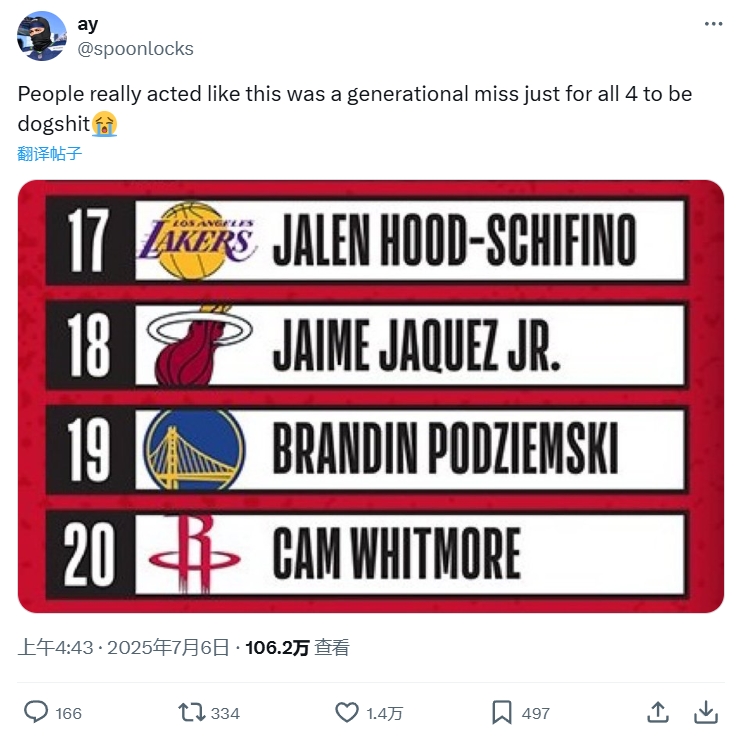 😅美网友扎心了:看起只是席菲诺垃圾 实际上4个都是垃圾 xiaoqiao 2025-07-13 nba 114 0 美网友晒这张经典的顺位图:人们表现得好像当时选择席菲诺没选其他几个是极大的失误,但实际上这四个都是垃圾。