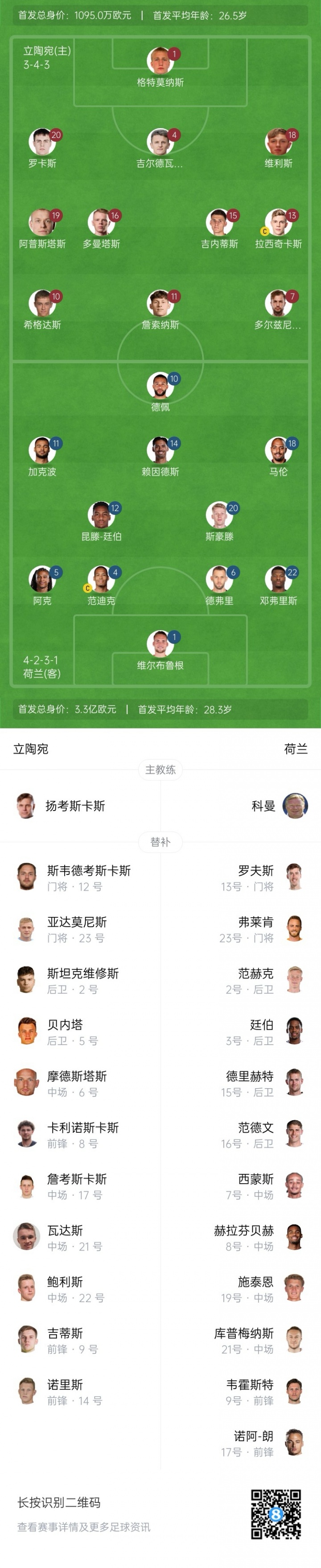 9月7日讯 欧洲区世预赛G组,立陶宛vs荷兰的首发阵容公布,比赛将在稍后的0点打响。